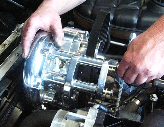On V1, V2, and V7 models ONLY, you will need to connect the oil drain line to the supercharger before mounting it to the bracket. We use stainless AN line and it is extremely tight in this area. The line MUST be oriented as shown in the picture to avoid contact with the tensioner. Double check this clearance after the installation is complete.